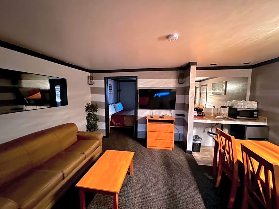 This room has a spacious living area and a wet bar area, along with a 40 inch LCD TV and a work desk.